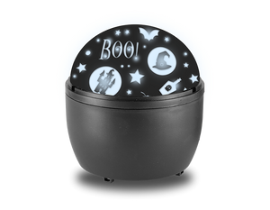 Each light projector features a rotating dome with a Halloween themed design and a two tone LED light. Switch on the side of the projector turns light on, off and sets timer.