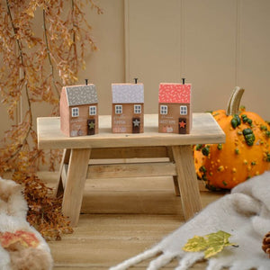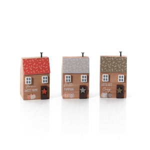 Add a charming seasonal touch to your décor with the Harvest Home Wood Houses, sold individually. Each house features 3D elements, painted windows, and roofs, accented with pumpkins, stars, and festive seasonal text. Available in warm red, gray, and green tones, these decorative pieces bring cozy autumn spirit to any shelf or mantel.