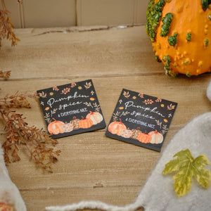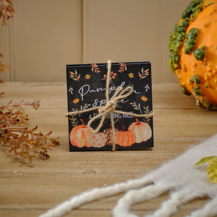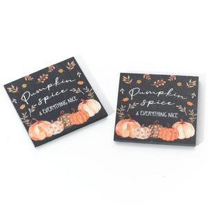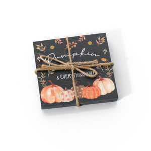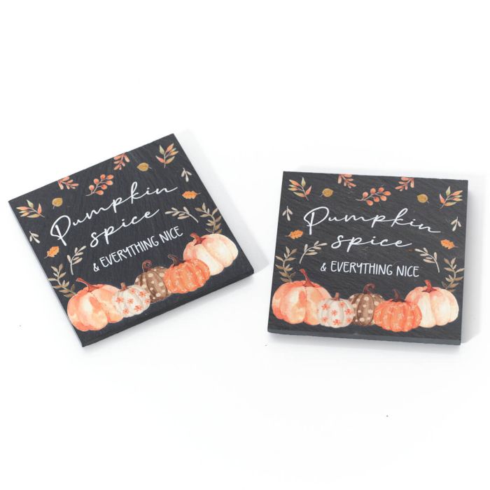 Protect your surfaces in style with this set of 2 square black slate coasters. Each coaster features a charming fall pumpkin and leaf motif, accented by the phrase "Pumpkin spice & everything nice" in crisp white lettering. Decorated with assorted orange, cream, and brown pumpkins along the bottom edge, these coasters bring a warm, autumnal touch to your home while keeping your tables safe from spills and stains.