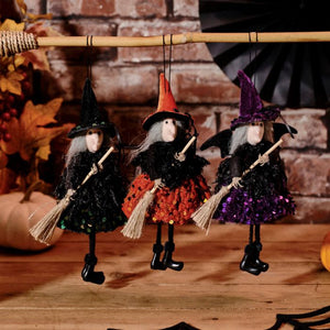 Elevate your Halloween décor with this set of three Spooktacular Sequin Hanging Witches. Each witch features a fabric body adorned with sparkling sequins, dressed in skirts and hats in vibrant purple, orange, and black with green accents. Complete with black shoes, long gray hair, and a broomstick, these charming figures come with strings for easy hanging. Perfect for adding a touch of magical whimsy and festive sparkle to your home this Halloween season.