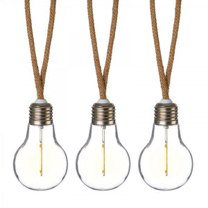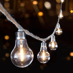 Party lights with a more natural feel, these clear bulbs are set on jute rope for a rustic vibe. Designed to fit right into gardens and outdoor spaces, complimenting trees, trellises and seating areas with a soft, warm white glow, these decorative bulbs are perfect for creating a cosy atmosphere all year round. Mains operated, this set of ten bulbs each have a warm white LED filament inside to complete the vintage feel, and with 4.5m of illumination, create a magical atmosphere indoors or outdoors beautifully lit bulbs.