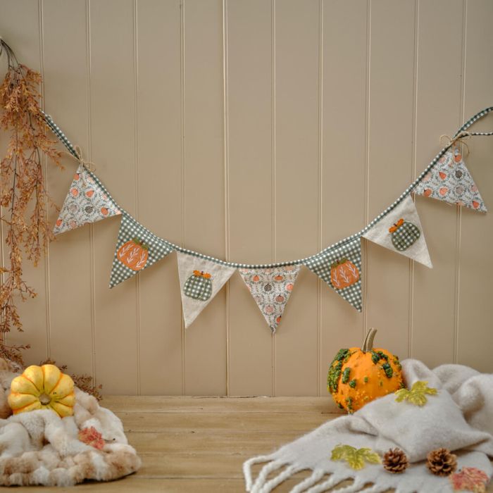 Harvest Home Pumpkin Bunting With Printing And Applique Decorate your space with festive charm using this fabric bunting featuring seven triangular flags. Each flag showcases printed patterns and appliqued pumpkins in...