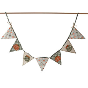 Decorate your space with festive charm using this fabric bunting featuring seven triangular flags. Each flag showcases printed patterns and appliqued pumpkins in warm green, orange, and beige tones. Strung together with ties at each end, this bunting adds a cozy, seasonal touch perfect for celebrating autumn and Halloween.
