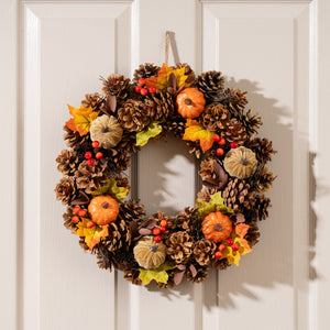 Celebrate the season with this 36cm Large Mini Autumn Pumpkin Wreath, beautifully adorned with rich foliage and pinecones. Its warm, natural tones bring a cozy, festive charm to any door or wall, instantly welcoming autumn into your home. Perfectly sized to make a statement without overwhelming your space, this wreath combines classic seasonal elements to create a timeless decoration that lasts throughout the fall. Add an inviting touch of autumnal spirit to your decor with this elegant and easy-to-hang wreath.