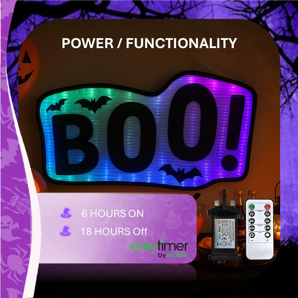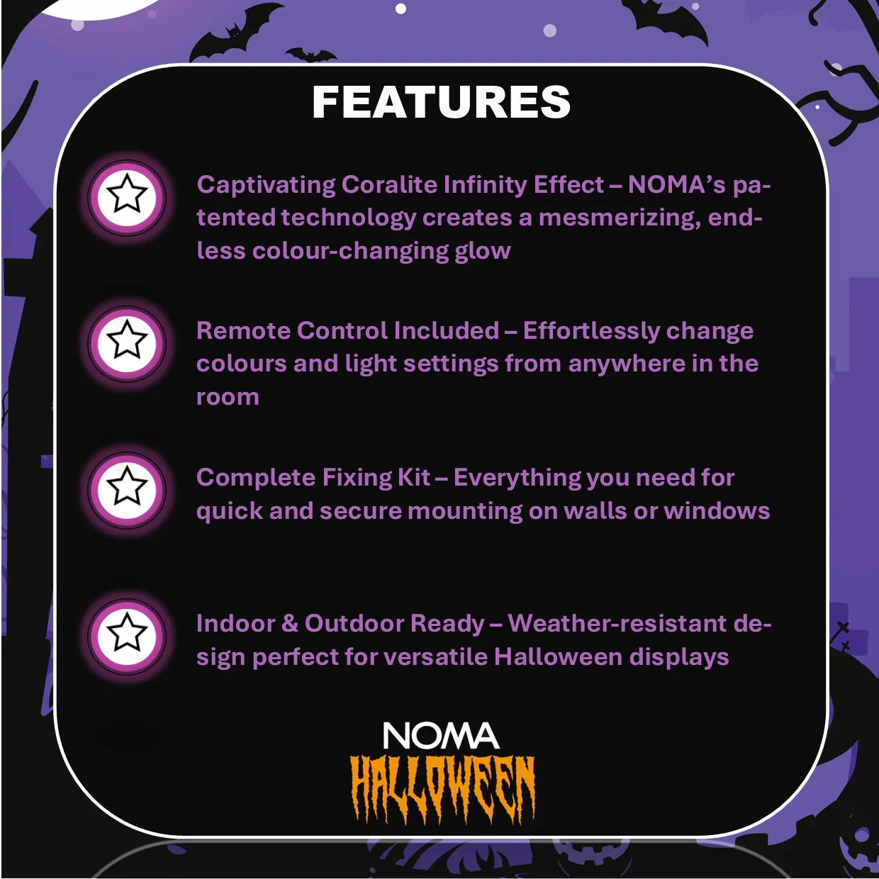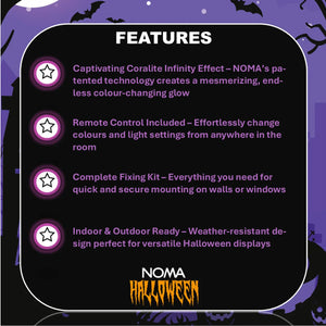 Make your Halloween celebrations unforgettable with this 50cm colour-changing Coralite Boo Sign. Featuring NOMA’s patented Coralite infinity light effect, it creates a stunning glow perfect for walls and windows. Includes a fixing kit and remote control for easy setup. Suitable for both indoor and outdoor use.