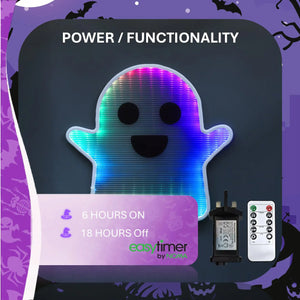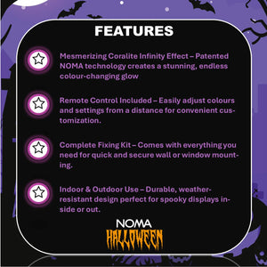 Elevate your Halloween décor with the 50cm colour-changing Coralite Ghost light. Featuring NOMA’s patented Coralite infinity light effect, it creates a mesmerizing glow ideal for walls and windows. Comes with a fixing kit and remote control for easy setup. Suitable for both indoor and outdoor use.