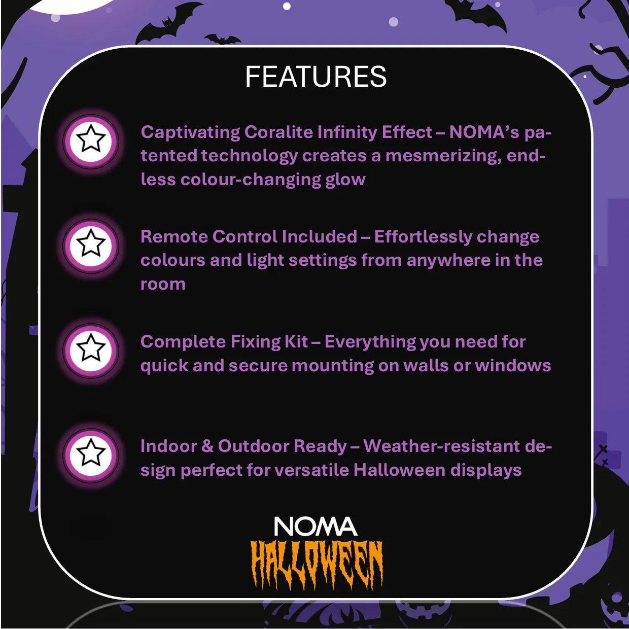 Make a bold statement this Halloween with the 50cm Coralite Trick or Treat pumpkin light. Featuring NOMA’s innovative and patented Coralite infinity light effect, this colour-changing decoration is perfect for adding eye-catching impact to walls or windows. Suitable for both indoor and outdoor use, it comes complete with a fixing kit and remote control for easy setup and operation.